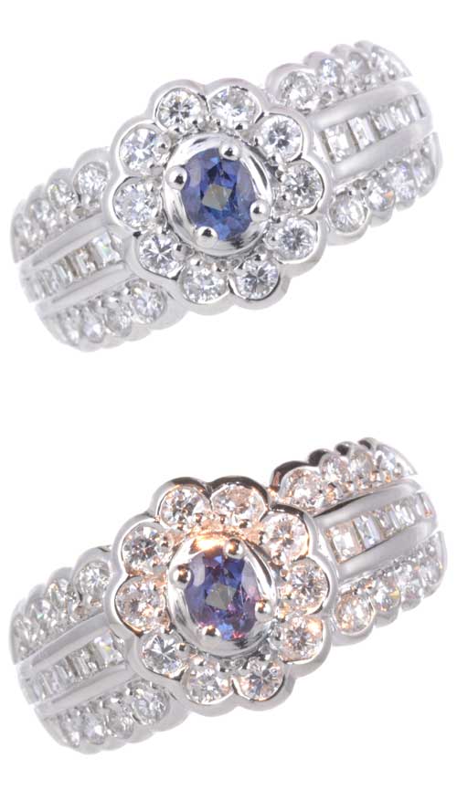 光の条件によって、色が違って見える宝石があるわ。アレキサンドライトなんかがそうね。これを変色効果というんですのよ。