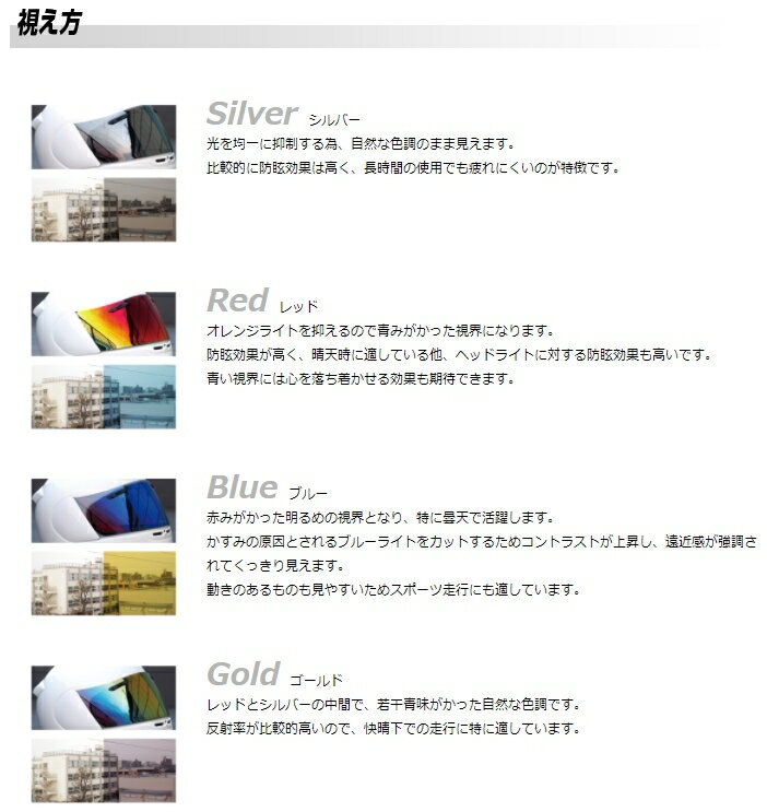 【各カラーの特徴】Red・・オレンジライトを抑えるので、心が落ち着く青みがかった視界になります。