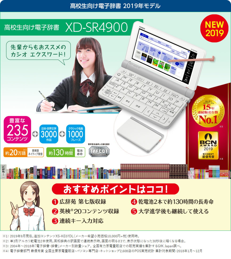 CASIO XD-SR49CCWESET(XD-SR4900※ハイレベル英和辞典 リーダーズ英和辞典 第3版/リーダーズ・プラス収録 + 専用ケース ホワイト セット) カシオ電子辞書 CASIO エクスワード 高校生モデル 235コンテンツ収録 製品仕様 品番 CASIO XD-SR49CCWE-SET (専用ケース ホワイト セット) 表示 5.7型タッチパネル(5.2型 864×480ドット TFTカラー液晶) 外形寸法 幅157.5×奥行101.0×高さ18.4mm(閉時) 質量 約285g(電池込み) 本体メモリー 約200MB 電源 単3形アルカリ乾電池LR6(AM3)の場合:約130時間※(英和辞典の訳画面で連続表示時) 約45時間(入力・検索4分間 / スピーカーで1分音声出力 / 英和辞典の訳画面55分間表示を繰り返したとき) eneloop(エネループ) / 充電式EVOLTA(エボルタ)の場合(参考値):約110時間(英和辞典の訳画面で連続表示時) 約40時間(入力・検索4分間 / スピーカーで1分音声出力 / 英和辞典の訳画面55分間表示を繰り返したとき) ※電池寿命はいずれも、新品のアルカリ電池、または満充電にした新品の充電池(eneloopまたは充電式EVOLTA)使用時、画面の明るさ3で表示状態になった30秒後に暗くなる場合。
