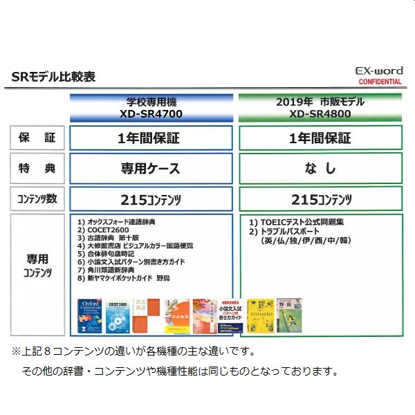 ※2020/9/29よりXD-SR47CCWE-SETを販売しています カシオ 電子辞書 EX-word エクスワード 高校生モデル AZ-SR4700edu同等品(XD-SR4700+純正ケース(セミハードカバータイプ 白:XD-CC2402WE/黒:XD-CC2402BK)) ※AZ-SR4700eduとは保証期間(1年間)と特典(ケースのみ)に違いがあります ※XD-SR4700と市販モデルXD-SR4800は一部収録コンテンツに違いがあります 【XD-SR4700にのみ収録】 オックスフォード連語辞典、COCET2600、古語辞典 第十版、大修館書店 ビジュアルカラー国語便覧、合体俳句歳時記、小論文入試パターン別書き方ガイド、角川類語新辞典、新ヤマケイポケットガイド 野鳥 【XD-SR4700には収録されていません】 TOEICテスト公式問題集、トラブルパスポート(英・仏・独・伊・西・中・韓) 【数量限定】【送料無料】 高校生のために、選びぬかれた215コンテンツ! 授業の予習・復習から受験対策まで これ1台で高校3年間をサポート 高校生モデル エクスワード XD-SR4700 ●センター試験6教科に対応 ●英語4技能(読む、聞く、書く、話す)をカバー ●英検対策やTOEIC対策もサポート ●軽量ながら丈夫で電池長持ち ●広辞苑(第七版)、ジーニアス英和辞典(第5版)、新明解国語辞典(第七版)など数多くの辞書・コンテンツを収録 全215コンテンツ 広辞苑 第七版 明鏡国語辞典 新明解国語辞典 等 英和辞典 / 和英辞典 ( ジーニアス オーレックス 等 ) ※詳細はメーカーHPでご確認願います。